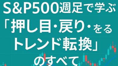 S&P500の週足チャートを教材に、押し目・戻り・レジサポ転換・三尊/逆三尊・EMAの役割を体系的に解説。長期トレンドの構造から環境認識を総まとめし、トレードで迷わない「大局の見方」を身につけるための実践編です。