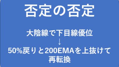 投資・副業 【環境認識】否定の否定|大陰線で下目線優位→50%戻りと200EMAを上抜けて再転換