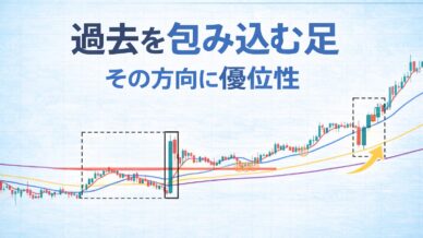 過去のチャートを包み込む大陽線(大陰線)が出たとき、なぜその方向に優位性が生まれやすいのかを実例で解説。包み込んだ本数(時間)と200EMA・水平線のレジサポ転換に注目し、未来予測ではなく「過去の否定(支配)」から相場の有意性を見つけます。