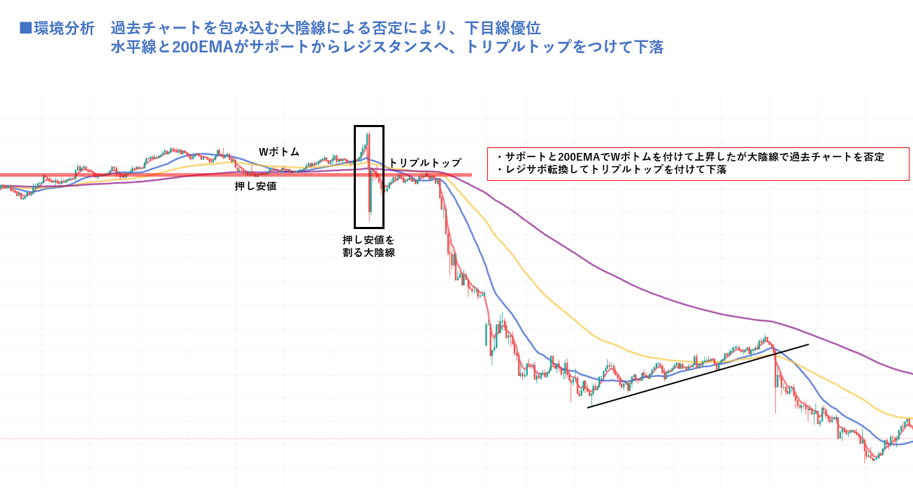 否定が出た後、価格は再び水平線と200EMA付近へ戻します。