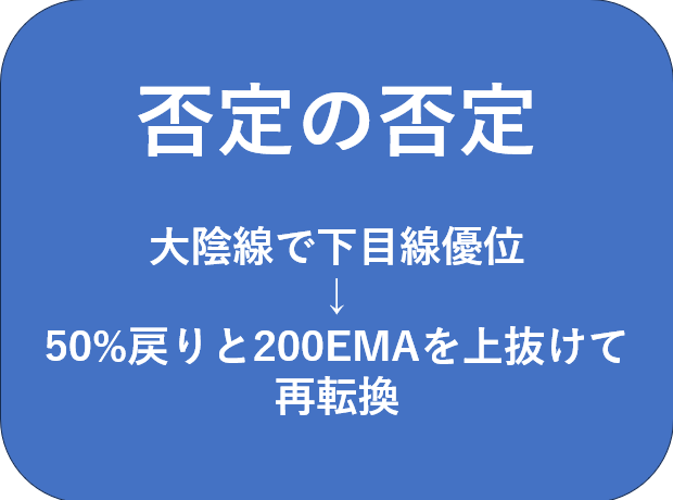これは、最初の大陰線が作った「下目線優位」を、さらに否定し返す動き(否定の否定)として見ることができます。