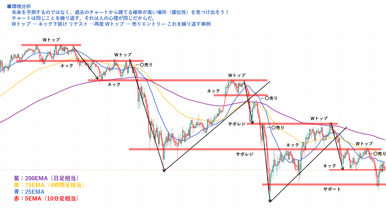 今回の例では、Wトップ → ネック割れ → リテスト → 再度Wトップ → 売りエントリーが繰り返されました。