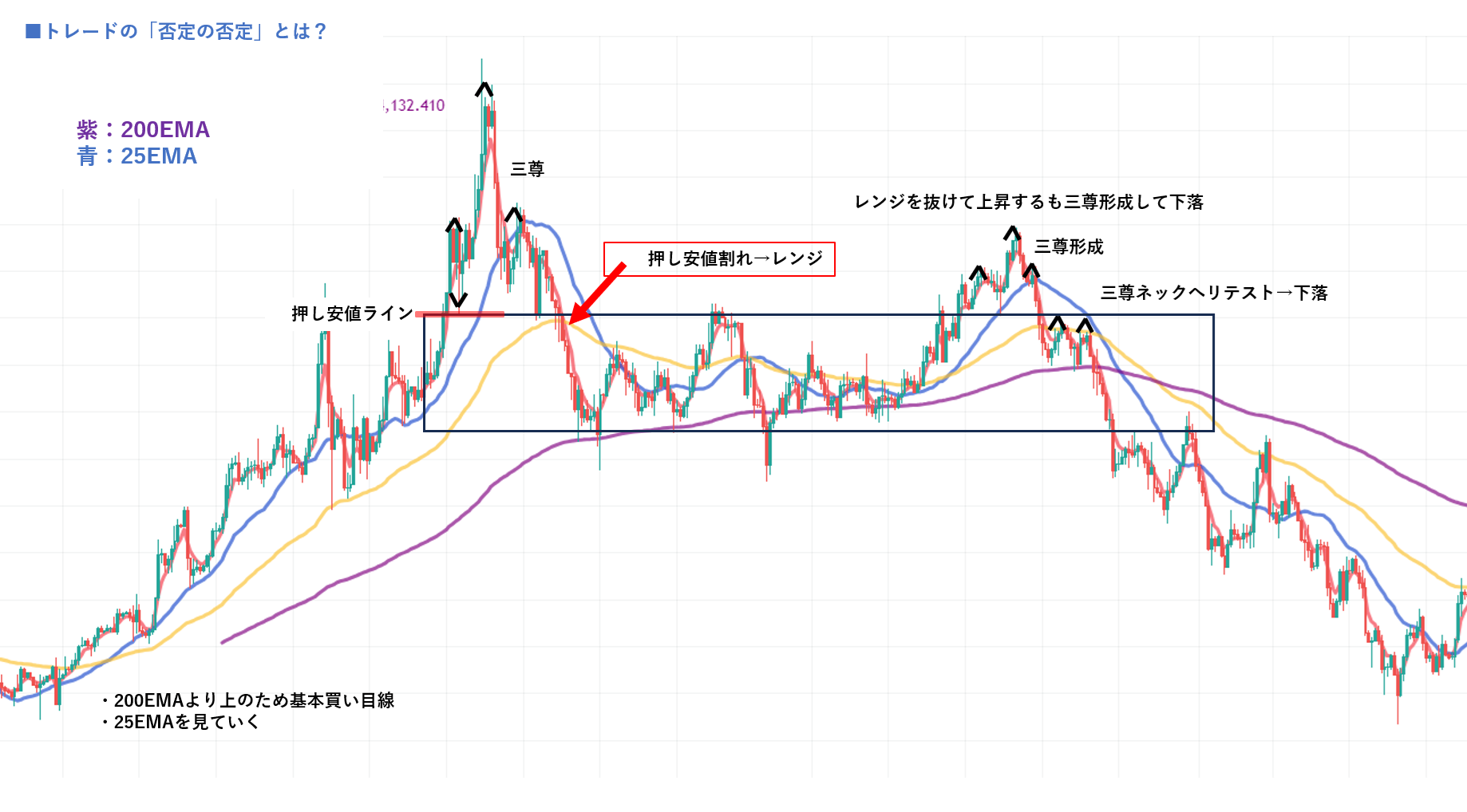 200EMAより上のため基本は買い目線でしたが、構造の変化によって売り目線に切り替わっていく流れを確認できます。