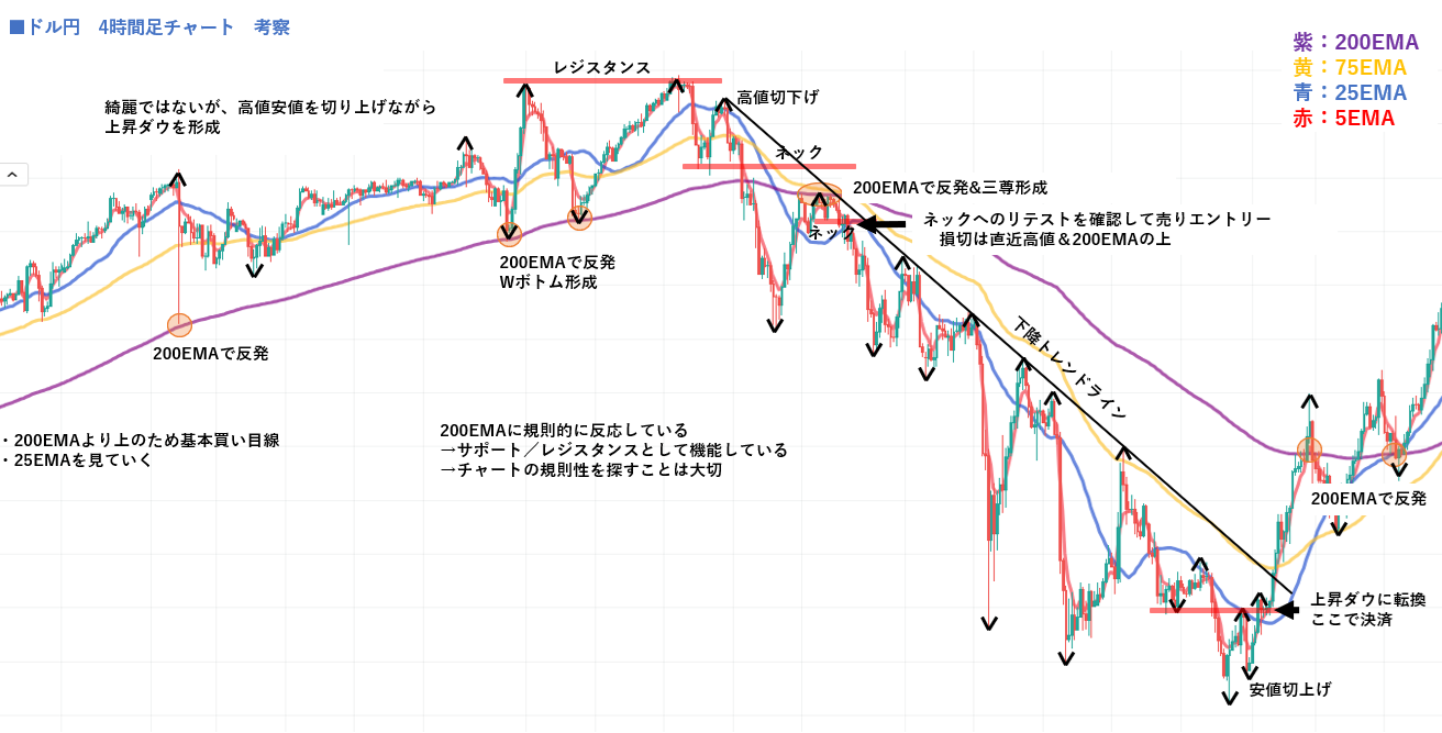 今回のチャートは、水平線やトレンドラインではなく、200EMAがレジサポとして機能していることに注目したケースです。