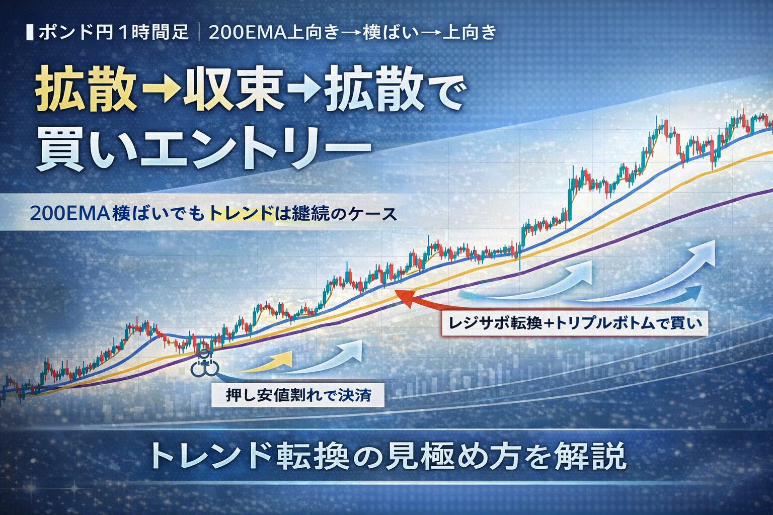 この「変化点(収束→拡散)を待つ」視点を入れると、200EMA基準のトレードがさらに安定します。