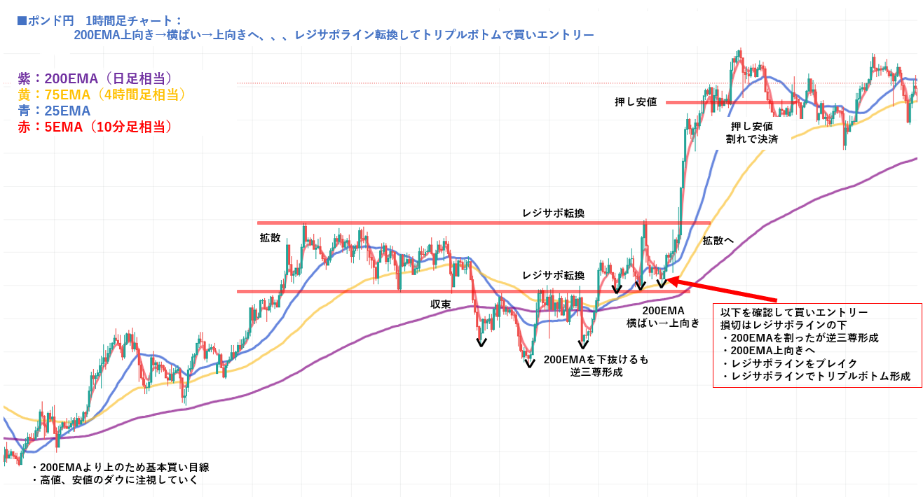 本記事では、ポンド円1時間足の実践事例を使って、200EMAを環境認識の軸にした買いエントリーの判断を整理します。
