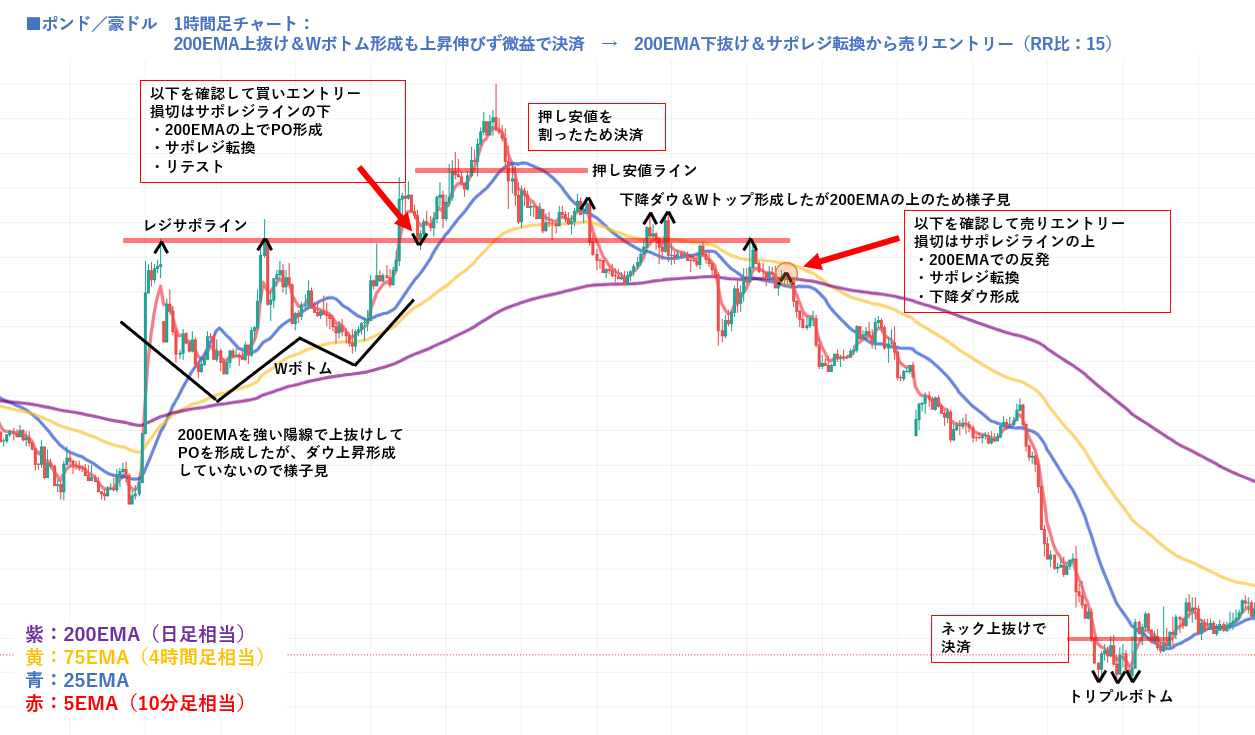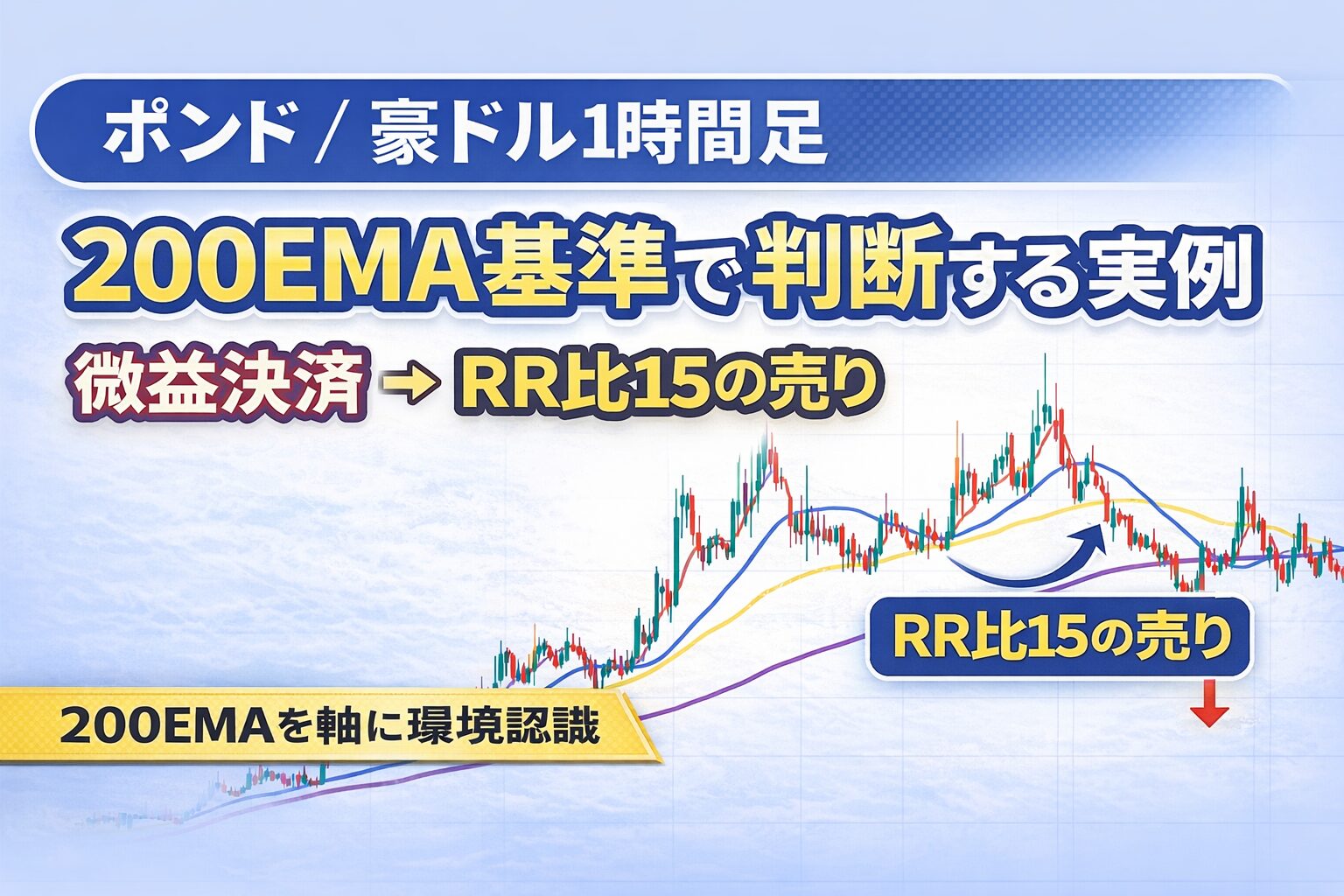 ポンド/豪ドル(GBP/AUD)の1時間足を、200EMAを軸に環境認識→エントリー→決済まで一貫して判断した実例です。