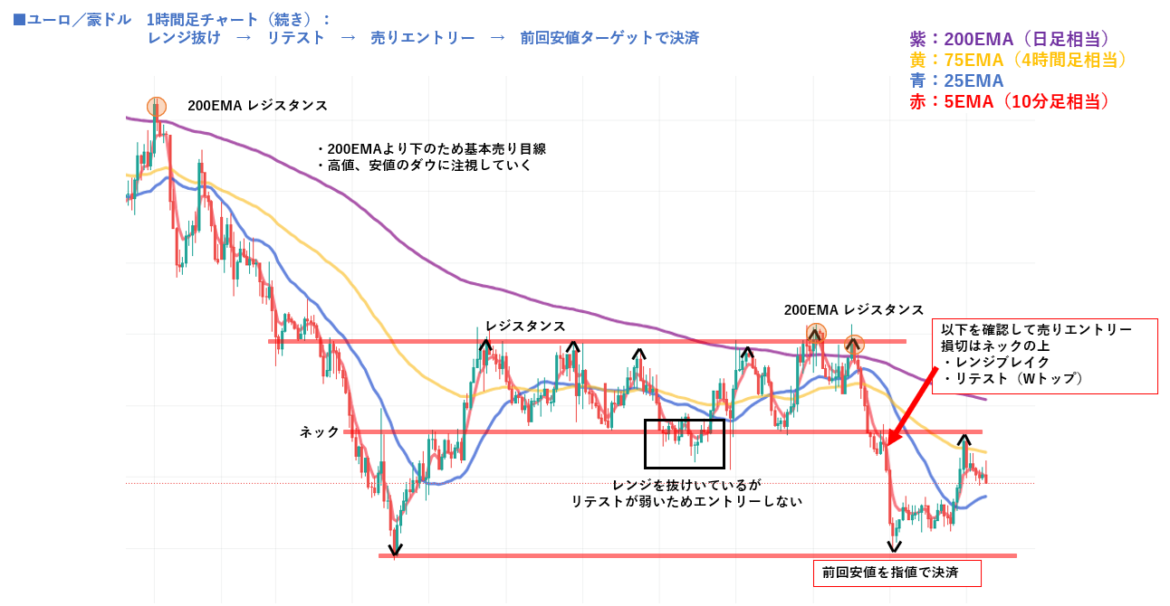 200EMAより下の局面では、レンジ中は待つ。抜けた後の「リテスト確認」だけで売る。