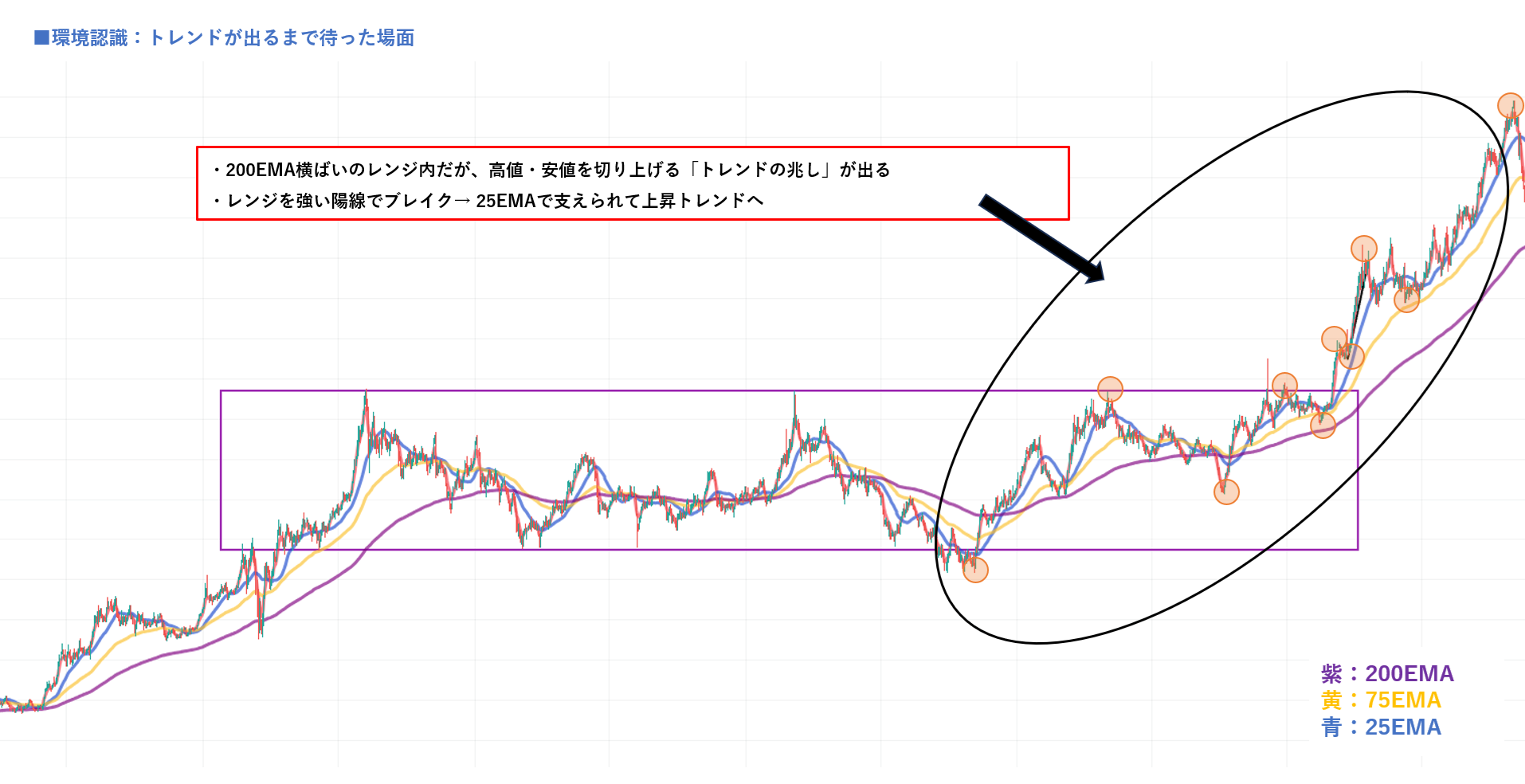 200EMAに傾きが出てトレンドが発生するまで待ったチャートの例