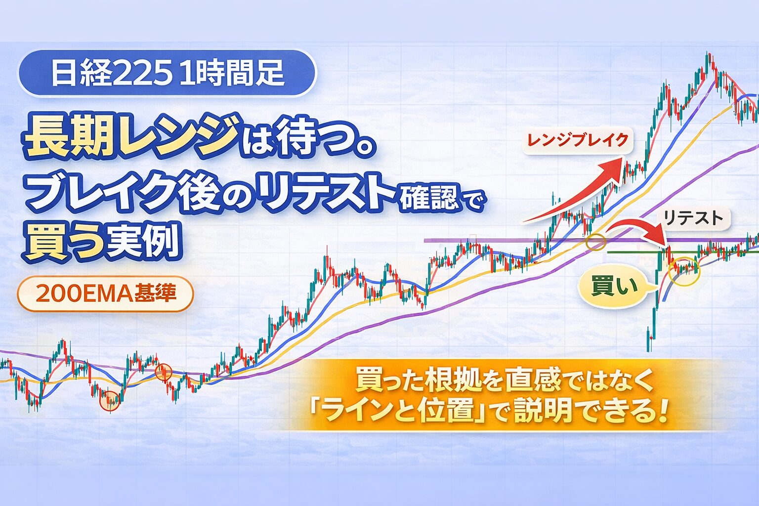日経225の1時間足を、200EMAを軸に環境認識→エントリー判断まで一貫して整理します。