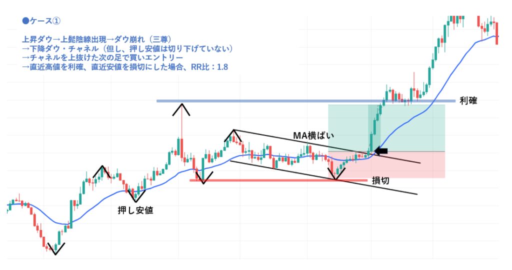 下降チャネル上抜け後の初動でエントリーできる構造。