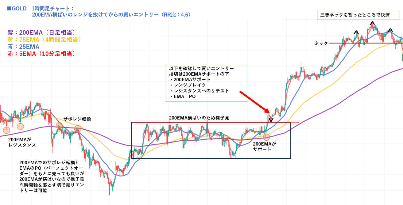 GOLD1時間足の200EMAを基準にした買いエントリー例。横ばいレンジは様子見、200EMAサポート確認後にレンジブレイクとリテストで買い、三尊ネック割れで決済(RR比4.6)。