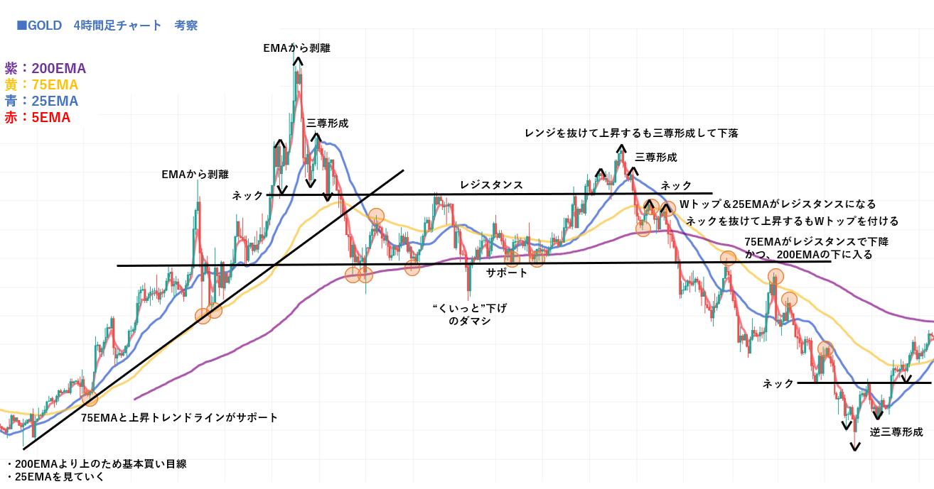 今回はGOLDの4時間足チャートを使い、エントリーポイントを探すことではなく、