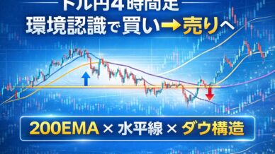 200EMAの向きで環境認識し、買いエントリーから売りエントリーへ視点を切り替えたドル円4時間足チャートの解説。押し安値や戻り高値、ネックライン、レジサポ転換を用いた再現性の高いトレード例を紹介します。