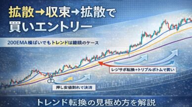ポンド円1時間足で200EMAを環境認識の軸に、上向き→横ばい→上向きの変化を確認。EMAの拡散→収束→拡散を手がかりに、レジサポ転換+トリプルボトムで買い、押し安値割れで決済する実例を解説。