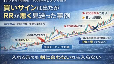 ポンド円1時間足で200EMAとダウを軸に売りエントリーし、等倍ターゲットで決済。200EMA上抜け後に買いの形は出たが、直近レジスタンスと損切幅からRRが悪く見送った判断を解説。