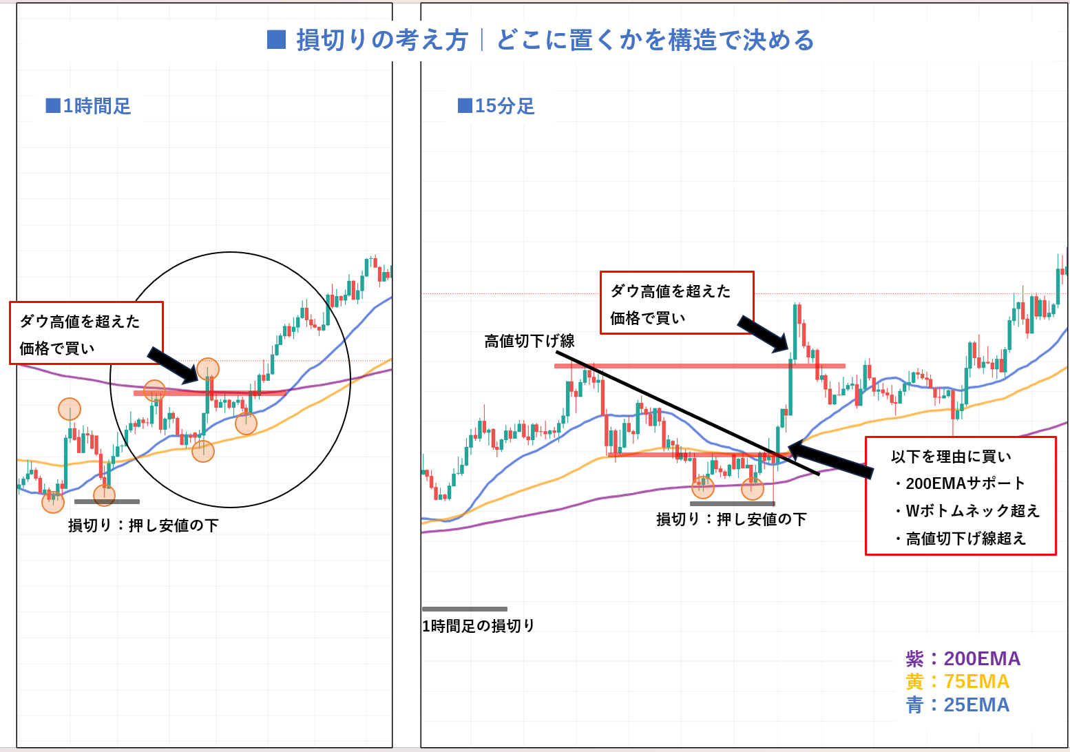 損切り幅を圧縮する方法を示すチャート図|左:1時間足の水平線超えエントリーで損切り幅が大きい、右:15分足で200EMAサポート・Wボトムネック超え・高値切下げ線超えの3根拠で早めにエントリーし損切り幅を圧縮した対比図