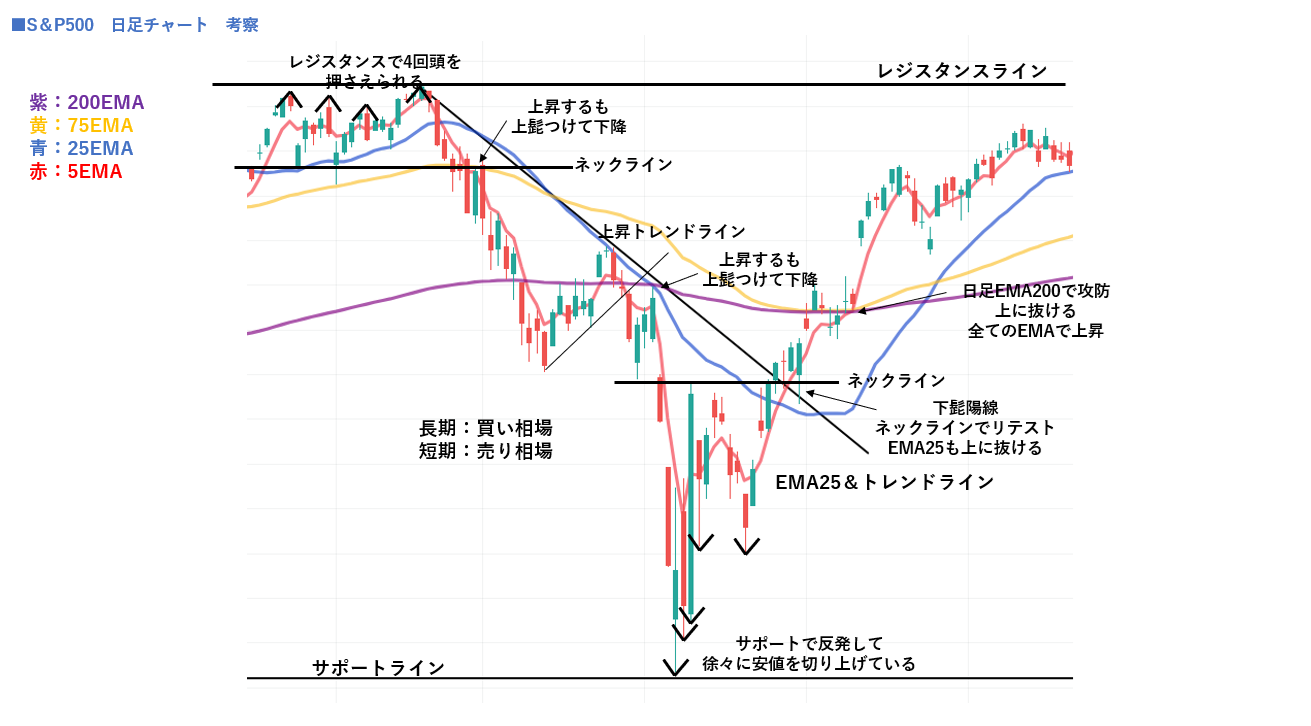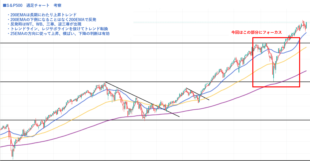 前回の記事では、S&P500の週足チャートを使って、長期トレンドの押し目・戻り・トレンド転換を整理しました。